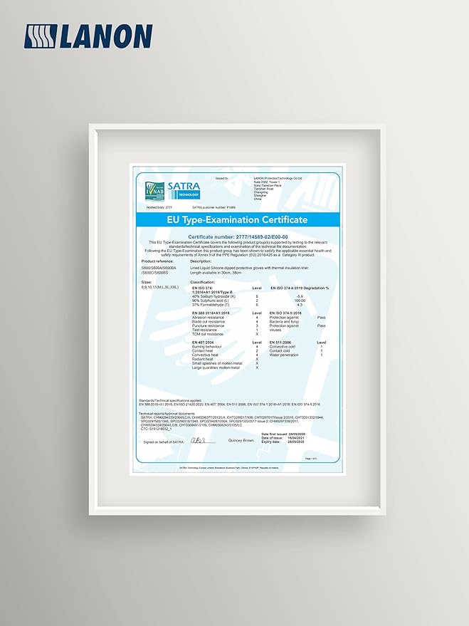 - Next level performance - LANON oven mitts for hand protection are certificated by CE 2777, with Standards EN 388:2016, EN 420, EN ISO374-5:2016, EN ISO374-1:2016/Type B, EN407:2004, EN511:2006, and meet CA Prop.65 regulations for phthalates. It also passed the US FDA 21 CFR 175.300 and EU specified requirements test.