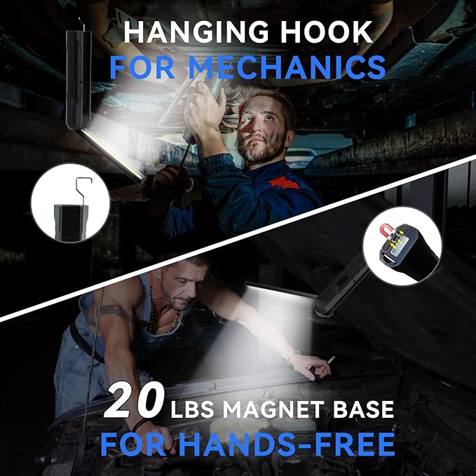 - 【High-Quality Material】: This COB Mechanic Flashlight is made of TPR+PC+Aluminum. Ergonomic handle with TPR material, non-slip and sweat resistant. Aluminum light bar base heat dissipation more, to maintain a stable brightness output.