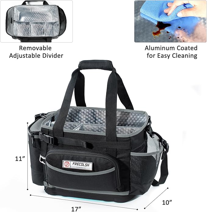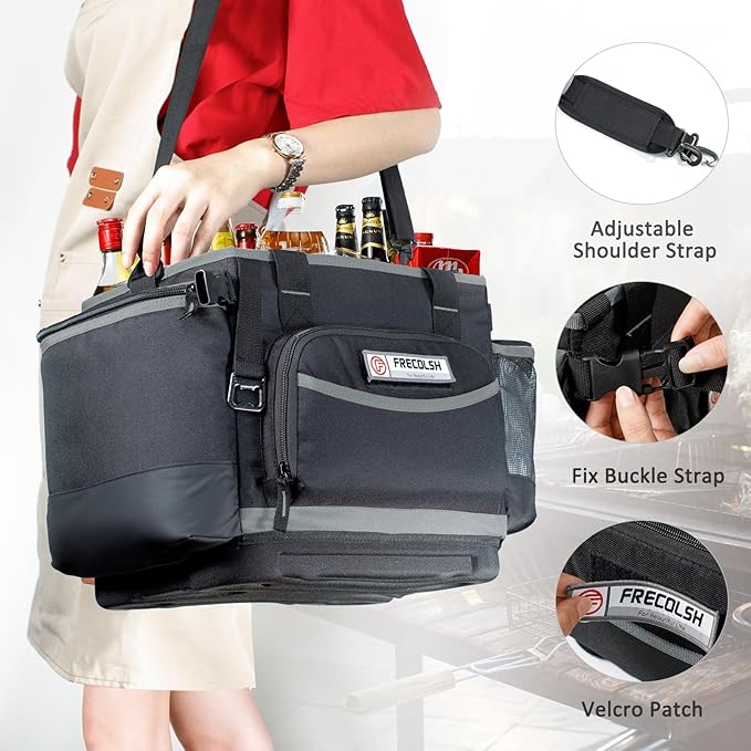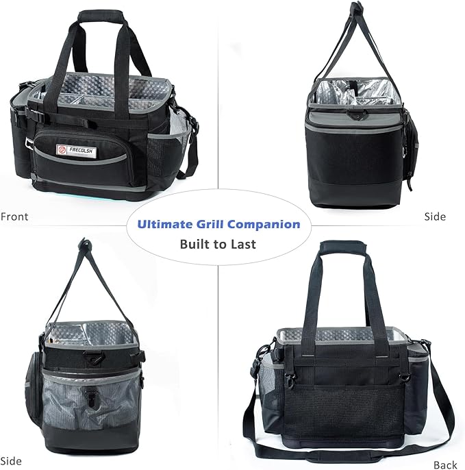 - [ ๐ฅBUILT TO LAST & Hard Plastic Base ] - Designed by a grill lover. Frecolsh grill caddy is made of water resistant sturdy material and reinforced with hard platic base. The lining is insulated aluminum coated which is easy to clean. This caddy is without lid. If you like the caddy with lid, please find the link in below or our store, we offer two options for you to chhose in our store.