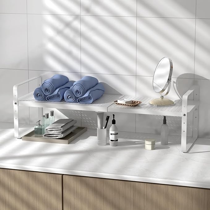 - MULTI-FUNCTIONAL EXPANDABLE ORGANIZER SHELF: It can be a rack or shelf to meet your organizational purpose. The surface has a mesh design, which can achieve the effect of draining. It is an excellent organizer of plates, bottles, cans, pots and pans. It is also a spice shelf for storing snacks, spices, condiments, fruits, etc. It is also the perfect organizer of the dresser. It will make your countertop more clean and tidy.