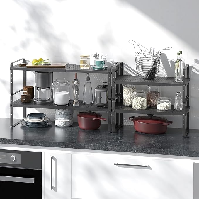 - EXTANDABLE KITCHEN COUNTERTOP ORGANIZER : This is a very flexible countertop organizer rack, and its height and length can be adjusted according to your needs. The size before expansion is 16.5 "L x 8" W x 9.6" H, the length of the shelf organizer can be stretched from 16.5 inches to 27 inches.