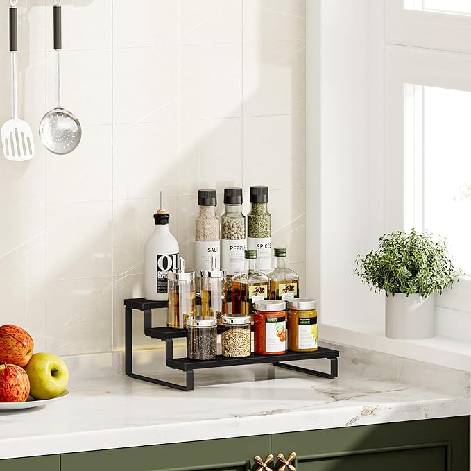 - Easy Access and Visibility: The tiered spice rack design allows for easy access and clear visibility of all your spices, so you can quickly find what you need while cooking. Say goodbye to rummaging through drawers and cupboards.