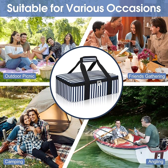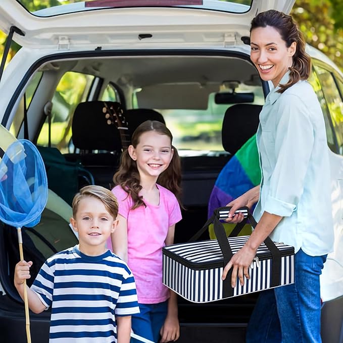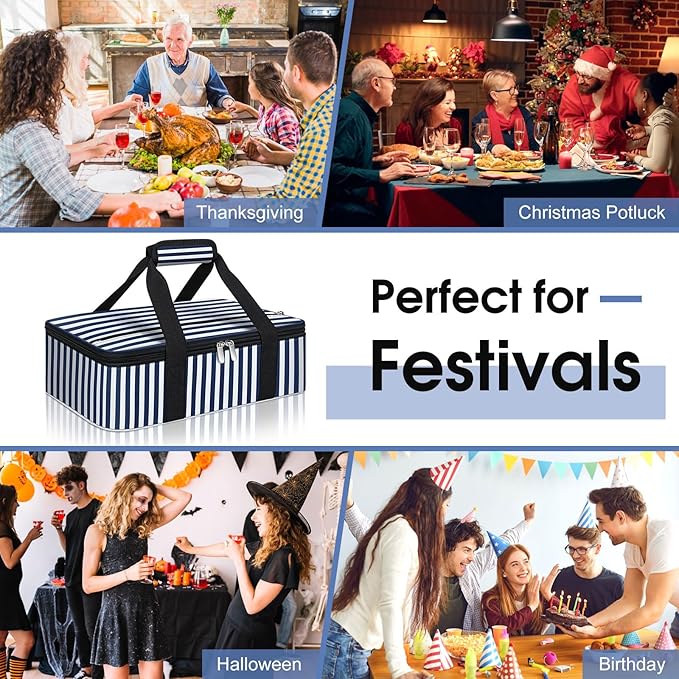 Insulated Casserole Carrier, Portable Casserole Carrier for Hot or Cold Food Lunch Tote Warmer or Cooler Bag, Lasagna Lunch Bag for Potluck Parties- Fits 9" x 13" Baking Dish-Blue Stripes