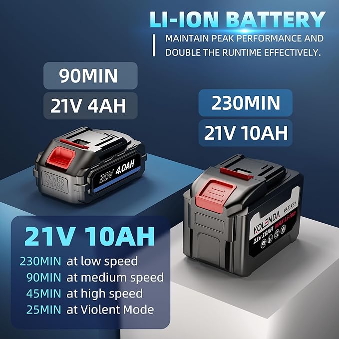 - 【High-Capacity Battery & Extended Runtime】KOLENDA cordless car dryer air blower features a 21V-10.0Ah battery with 4 adjustable speed modes (25-230min runtime) and a smart power display. Perfect for prolonged patio cleaning, car drying, and lawn care. Built-in safety system ensures reliable operation.