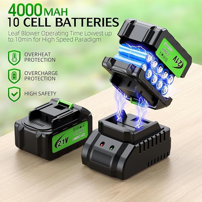 - ๐๐ฉ๐ ๐ซ๐๐๐ ๐ญ๐จ 2 ๐๐๐ญ๐ญ๐๐ซ๐ข๐๐ฌ & ๐๐๐๐ ๐๐ก๐๐ซ๐ ๐๐ซ: Cordless leaf blower comes with two 21V-4.0Ah batteries and a safe charger, leaf blower can work continuously for 20 minutes in high-speed mode (10 minutes per battery) and in low-speed mode can work for up to 30 minutes! When the battery is depleted, insert the battery into the charger and the indicator will light up red, wait until the above indicator turns green to indicate that it is full